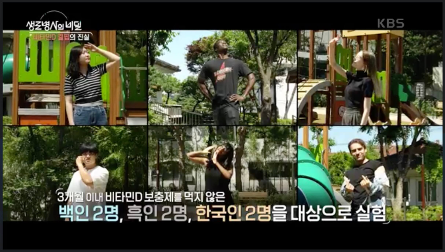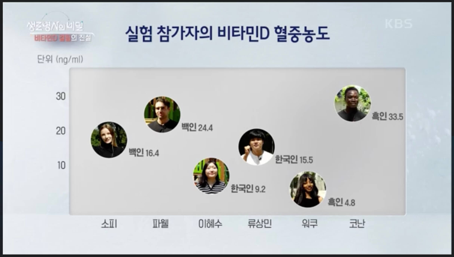 3개월 이내에 비타민D 보충제를 먹지 않은 백인 2명, 흑인 2명, 한국인 2명을 대상으로 비타민D 혈중농도를 측정해 보는 실험을 해보았는데요. 햇빛 노출 부위나 면적 등은 비슷한 조건이었습니다. 실험 결과 백인이 비타민D 혈중농도가 가장 높았고 그다음이 한국인, 흑인 순이었습니다. 예외적으로 흑인 한 명이 비타민D 수치가 30ng/ml 이상으로 높았는데 이 사람은 최근 필리핀과 코트디부아르로 여행을 다녀왔다고 하네요.