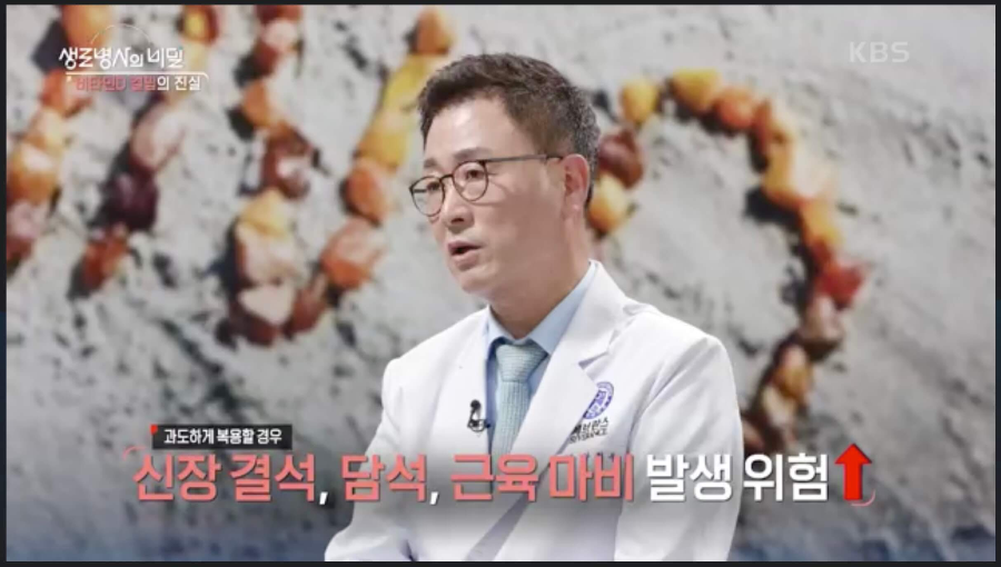 생로병사의 비밀 | 비타민D 과다 복용의 부작용? “ 신장 결석, 담석, 근육 마비 발생 위험 높일 수도... ” Copyright ⓒ KBS. All rights reserved. 무단 전재, 재배포 및 이용(AI 학습 포함) 금지