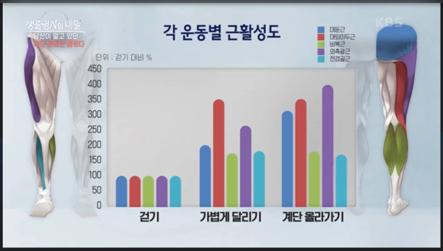 하지근육 5군데에 근활성도를 측정할 수 있는 장치를 하고 각각의 운동을 하는 실험의 결과 걷기나 가볍게 달리기보다 계단 올라가기의 하지 근육 활성도가 더 많이 증가하는 것을 볼 수 있습니다.