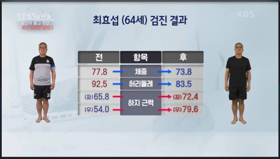 계단 운동 4주 프로젝트 결과 김정숙 씨의 하지 근력이 큰 폭으로 상승했습니다. 최효섭 씨 역시 체중이 감소되고 하지 근력도 증가되었으며 좌우 근력차이도 많이 줄어들어 균형을 이루게 되었습니다.