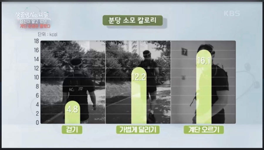계단 오르기가 걷기나 가볍게 달리기와 비교했을 때 인체에 어느 정도의 영향을 주는지 그 차이를 비교해 보는 실험을 진행했습니다. 그 결과 계단 오르기는 걷기나 가볍게 달리기보다 심박수가 더 많이 증가했을 뿐 아니라 분당 소모 칼로리도 가장 높게 측정되었습니다.