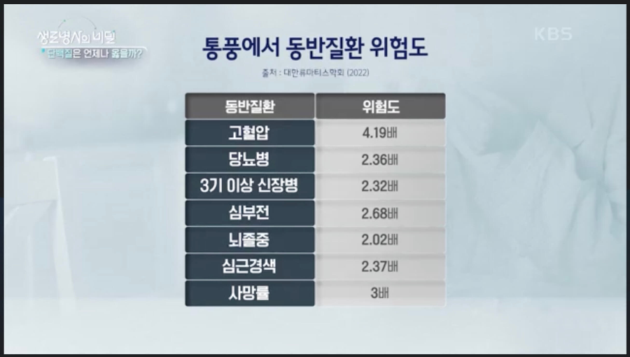 통증이 없다고 해도 통풍을 치료해야하는 이유는 통풍의 원인인 요산이 각종 질환의 발생 위험을 높이기 때문입니다. 통풍이 있는 경우 사망률이 3배나 증가하게 됩니다. 또한 요산이 높으면 그것이 신장에 침착되고 이에 따라 만성콩팥병 발생 위험이 높아지게 됩니다. 단백질 섭취가 요산생성과 콩팥부담에 관련이 있는 만큼 단백질 과잉 섭취를 경계하여야 합니다.