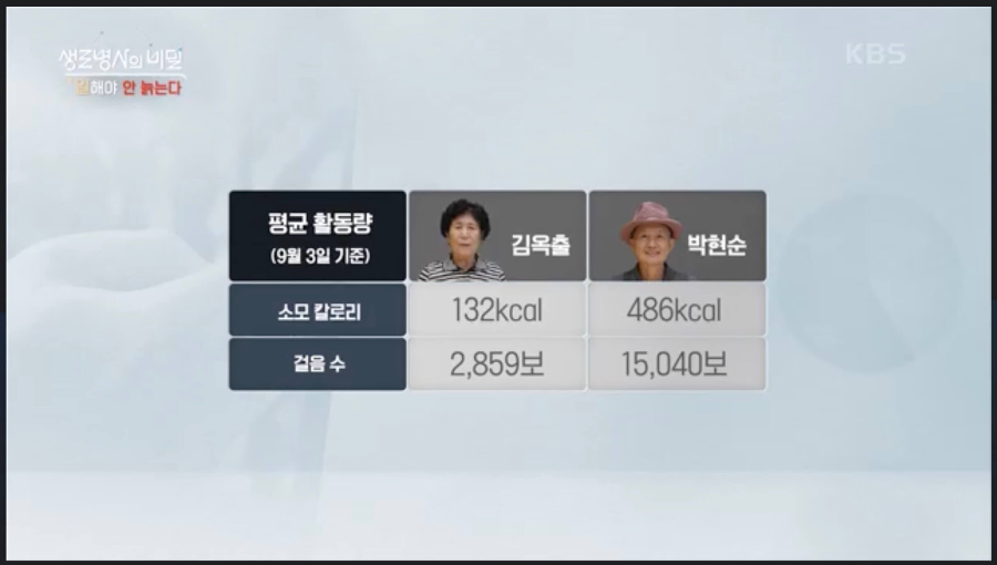 한마디로 김옥출씨는 좌식 위주의 생활로 신체활동이 저조하고 박현순 씨는 노인 근로, 지하철 택배 등의 일로 신체활동이 활발한 편입니다. 두 사람의 건강 상태를 비교해 보면 어떨까요?