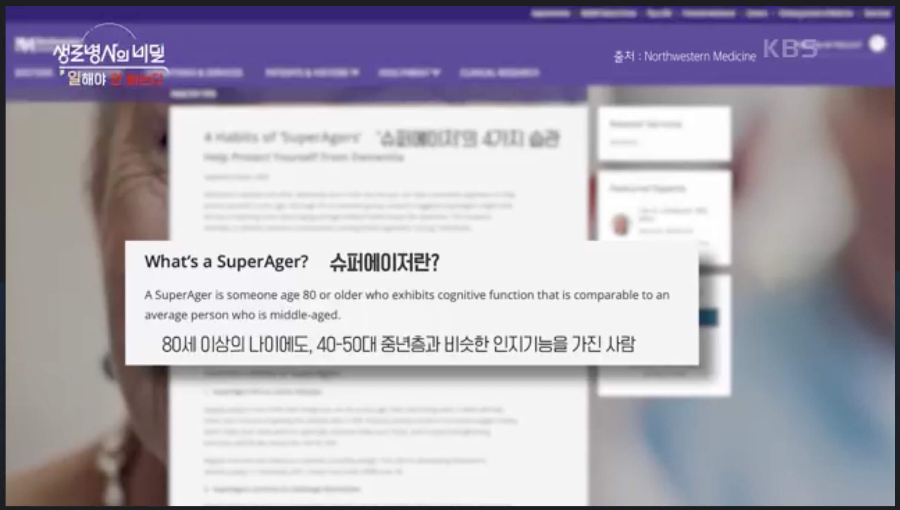 100세가 넘은 나이에도 건강한 삶을 유지하며 생활하는 사람들을 슈퍼에이저라고 한다. 이러한 슈퍼에이저들의 공통점은 무엇일까? 바로 일을 하고 있다는 것이다. 단순히 생계유지 수단으로써의 의미를 넘어선 '일'의 가치에 대해 생각해 보고 노쇠를 막기 위해서 할 수 있는 것이 무엇인지에 대해서도 알아보는 시간을 KBS1TV 생로병사의 비밀 928회를 리뷰하며 가져보자