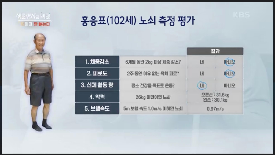 한국의 슈퍼에이저 홍응표님은 가만히 앉아 있으면 더 아픈데 움직이면 안 아프다고 한다. 102세의 나이에도 아침 6시부터 일어나 아침을 먹고 나서 온갖 농사일을 다 하며 하루를 보내는 홍응표 씨. 이런 홍응표 씨의 노쇠 정도를 측정해 보았다.