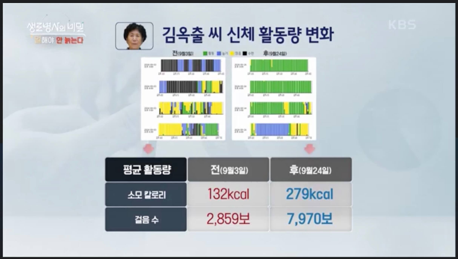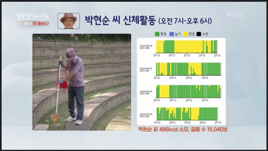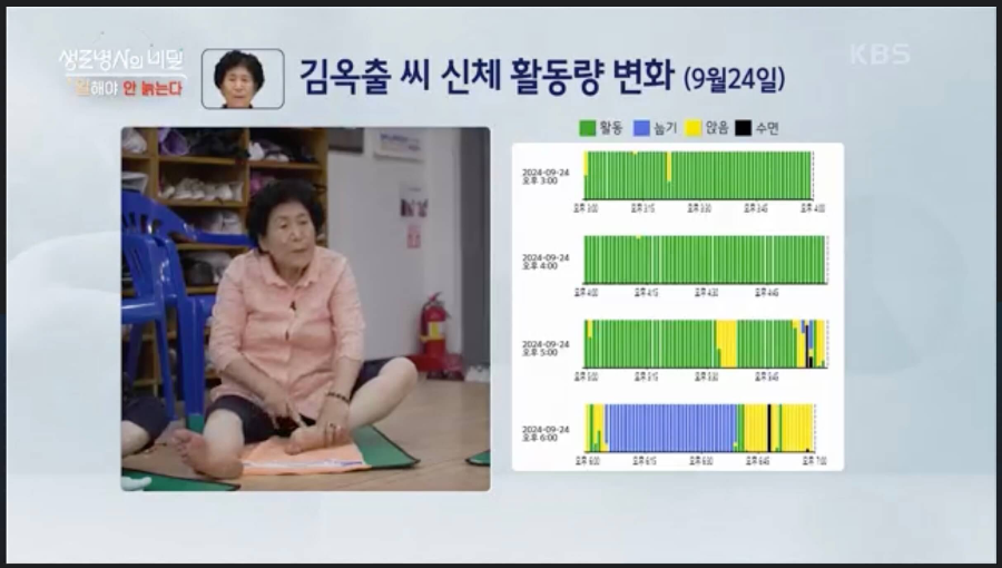 24시간 동작 감지기를 착용하고 보았을 때 김옥출 씨는 앉아있거나 누워있는 시간이 많아 그래프에서 노란색, 파란색이 많이 보이고 하루 소모 칼로리는 132kcal, 걸음수는 2859보로 측정되었습니다. 박현순 씨는 일하는 시간이 많아서 그래프에서 초록색이 대부분이었고 하루 소모 칼로리는 486kcal, 걸음수는 15040보로 측정되었습니다.