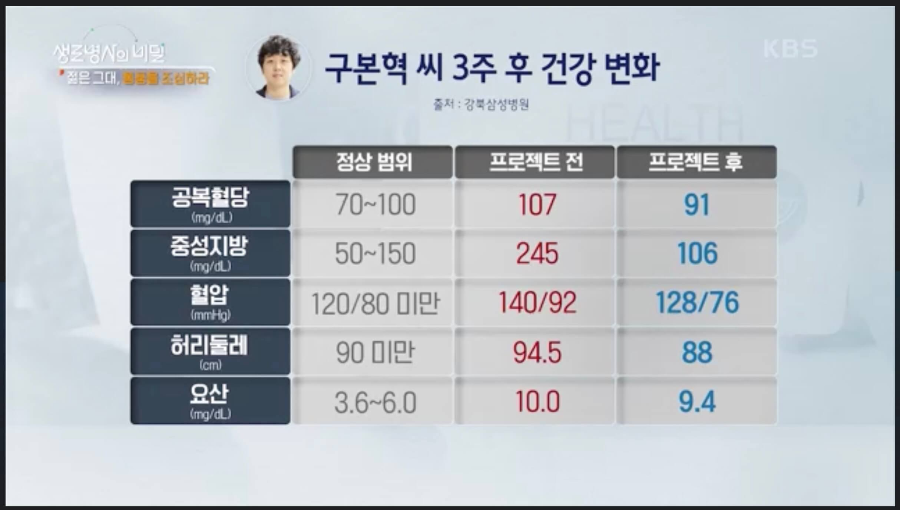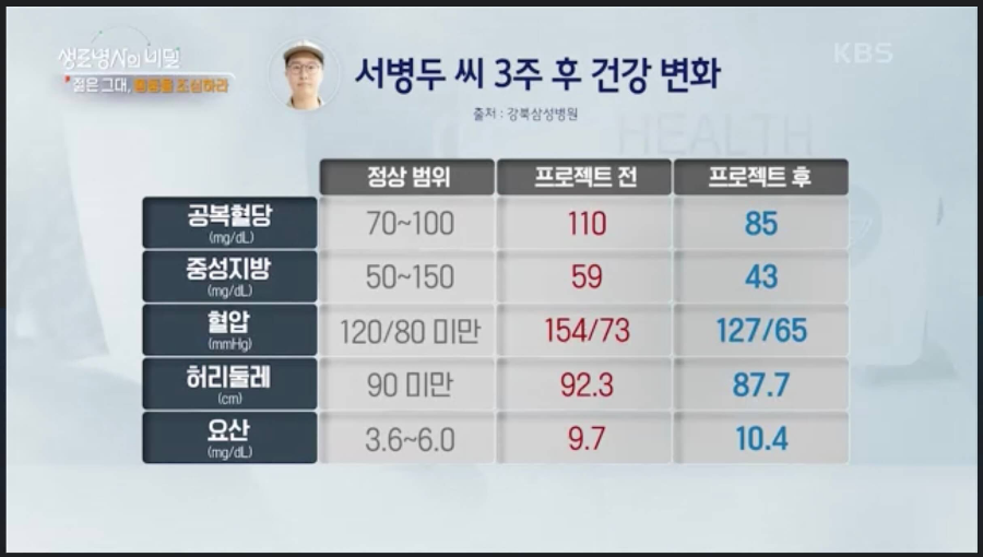 결과는 어떻게 되었을까요? 구본혁 씨는 공복혈당, 중성지방, 혈압, 허리둘레 및 요산 수치 모두 정상범위 내로 줄어들었습니다. 서병두 씨도 공복혈당, 중성지방, 혈압, 허리둘레가 모두 좋아졌습니다. 다만 요산 수치는 줄어들지 않았는데요. 요산수치는 3주 만에 유의미하게 떨어지기는 어렵기도 하고 탈수 등 몸의 상태에 따라서 수치가 달라질 수 있다고 하네요.