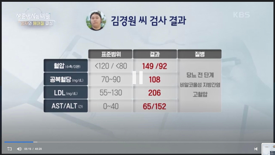 김경원 씨의 검사 결과 혈압이 높고 공복혈당 수치도 높으며 콜레스테롤 수치 및 간수치도 정상보다 높은 수치를 보였다. 술을 먹지 않는 김경원 씨가 간수치가 높은 것은 지방간이 원인인 것으로 볼 수 있다. 당뇨 전 단계, 비알코올성 지방간염, 고혈압 등 각종 대사질환이 진단되었다.