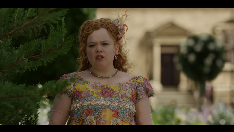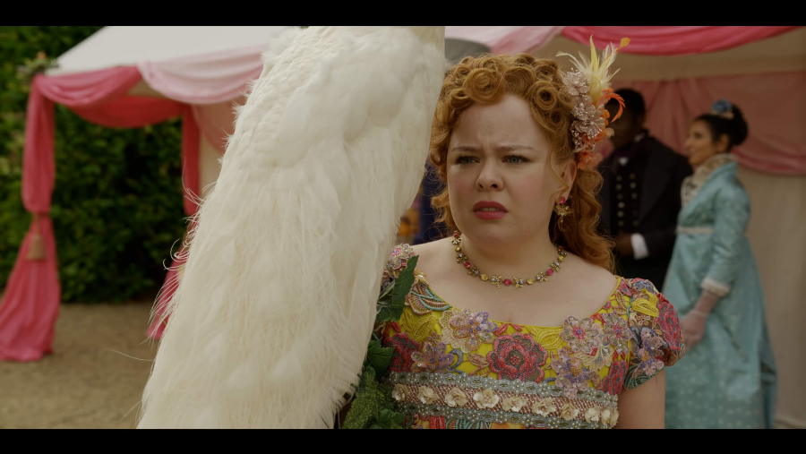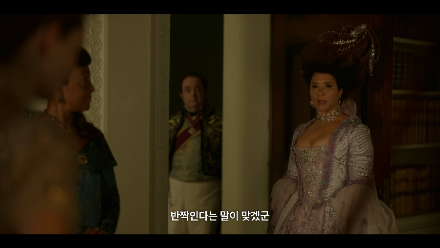 예쁘게 꾸미고 머리에 깃털까지 쓰고 사교계에 데뷔하는 프란체스카 브리저튼. 그러나 기대했던 것과는 달리 샬럿 왕비의 반응은 시큰둥합니다. 예전 다프네가 데뷔했을 때 다이아몬드라 지정하며 크게 관심을 주었던 샬럿 왕비이지만 이번 시즌에는 그렇게 마음에 드는 처자가 없는 듯합니다. 지루해하는 모습이죠.