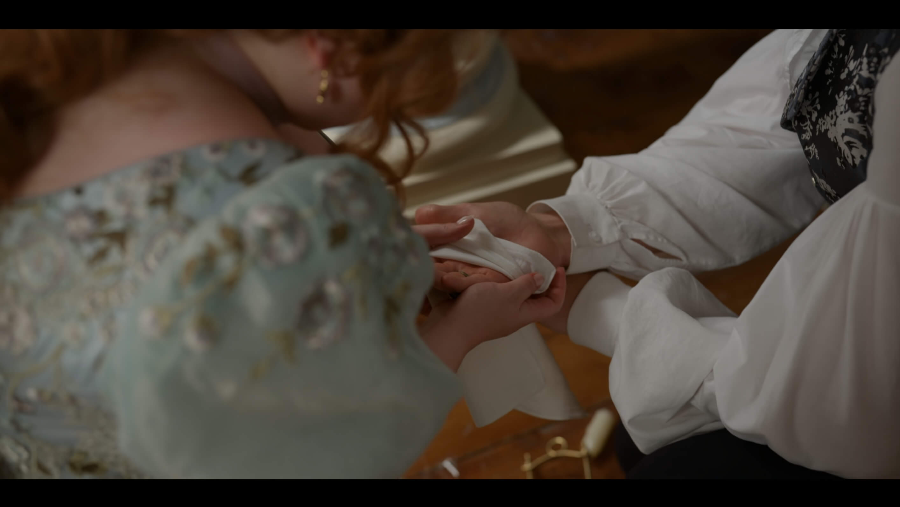 콜린 브리저튼의 집에서 열심히 수업을 받던 페넬로페. 엘로이즈가 오자 들키지 않기 위해 콜린 방으로 숨어들어갑니다. 거기서 콜린의 일기를 보게 되고 이에 콜린이 화를 내자 실수로 책상위에 있던 등이 떨어져서 깨지게 됩니다. 이것을 줍던 콜린이 손을 다치자 페넬로페가 콜린의 손을 천으로 감싸서 드레싱을 해줍니다. 수업을 하는 건지 둘이 꽁냥꽁냥하는 건지 잘 모르겠는 상황ㅋ