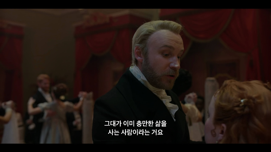 레이디 브리저튼은 아들 콜린의 속마음을 꿰뚫고 있는 듯합니다. 콜린에게 오늘 밤 페넬로페가 청혼을 받게 될 것 같다는 소식을 전하죠. 이에 콜린은 고민하다가 페넬로페에게 갑니다. 데블링 경과 춤을 추고 있는 페넬로페. 데블링 경에게 질문을 합니다. 여행을 자주 떠나시니 실리적인 짝을 찾으시는 것을 이해한다. 그런데 시간이 흘러 언젠가는 사랑이 피어날 수도 있는 건가요? 이 질문에 데블링 경은 일이 자신의 마음의 대부분을 차지하고 있어 솔직히 공간이 없을 것 같다고 말합니다. 그러면서 다행히 당신이 이미 충만한 삶을 사는 사람이라서 기쁘다고 하네요. 한마디로 사랑은 없을 것 같다고 말하는 데블링 경. 이때 나타난 콜린. 잠깐이면 된다며 데블링 경에게 자리를 비켜달라고 합니다. 당황하는 페넬로페에게 콜린은 이 결혼을 하면 안 된다고 말하는데요.