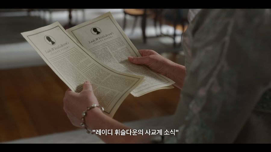 페넬로페는 엘로이즈에게 걱정하지 말라며 자신이 소식지를 바로 내서 크레시다가 가짜라는 것을 밝히겠다고 합니다. 크레시다는 브리저튼 가족의 이야기를 소식지에 썼습니다. 레이디 브리저튼은 위대한 사랑을 강조하는데 그것이 사랑을 밝히는 것인지 욕정인지 모르겠다. 브리저튼에게 자식이 많은데 다 같은 혈통인지 알 수가 없다는 식으로 비꼬는 내용이었죠. 위기에 빠진 브리저튼가. 그런데 이때 또 다른 사교계 소식지가 전달됩니다. 바로 진짜 레이디 휘슬다운인 페넬로페가 쓴 소식지이죠. 자신은 크레시다가 아니고 그녀가 자신을 사칭하고 있으며 자신의 뛰어난 관찰력으로 알게 된 소식들은 이런 것들이 있다는 내용이었습니다. 그리고 레이디 휘슬다운은 거짓말을 하지 않는다는 것도 덧붙였습니다. 이로써 브리저튼 가는 다행히 위기에서 벗어날 수 있었습니다만.. 페넬로페가 인쇄소에 글을 전달하는 것을 콜린이 목격하게 됩니다. 그리고 레이디 휘슬다운이 자신이 사랑하는 여인인 페넬로페였다는 것을 알게 됩니다.