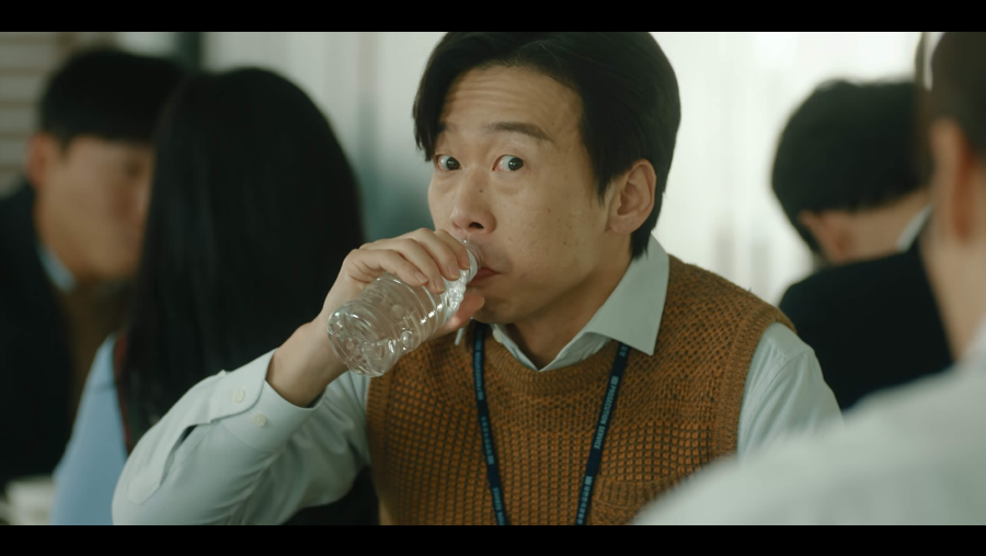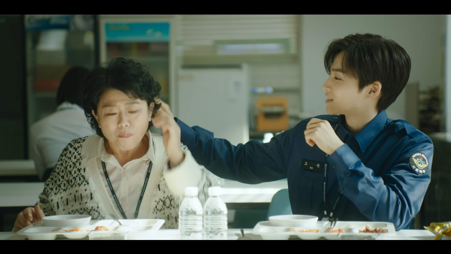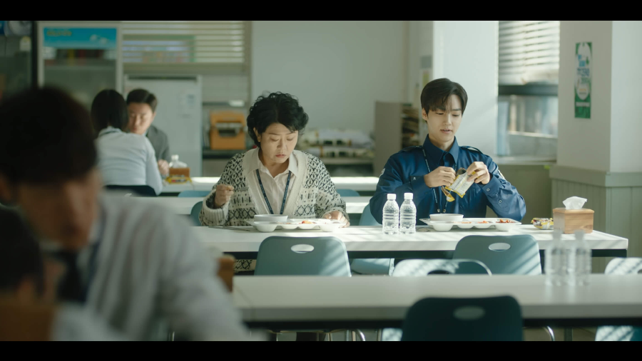 점심시간에 구내식당에서 밥 먹고 있는 임순 옆자리에 앉은 고원. 50대 아줌마에게 반말 시전하며 한껏 친한 척을 해줍니다. 임순의 머리를 넘겨주고 물을 마시도록 챙겨주면서 사람 설레게 하는 웃음 짓는 고원.