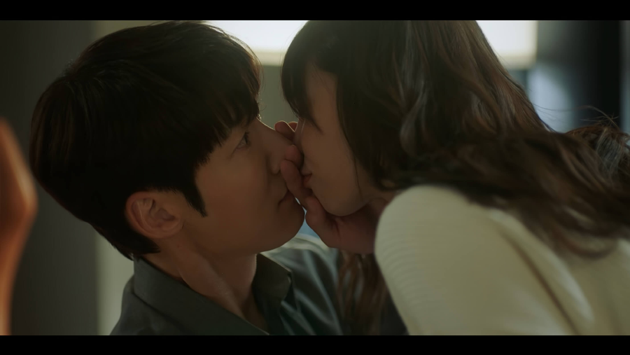 지웅의 입술로 돌진했던 미진. 그러나 지웅은 그런 미진의 입술을 손바닥으로 막았습니다. 지웅과의 뽀뽀가 불발되고 역대급 흑역사를 쓰게 된 미진은 너무 민망해서 얼굴을 손으로 가립니다.