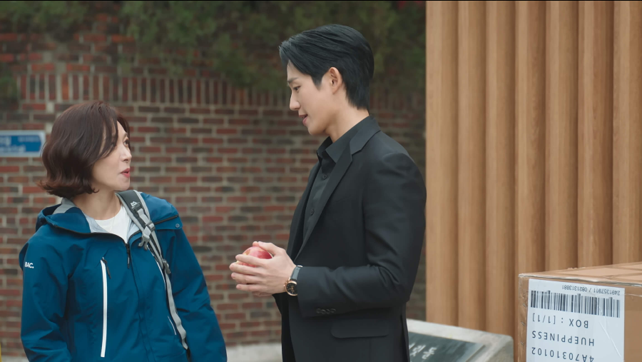 예전 동네 목욕탕이 있던 자리에서 승효와 재회한 석류. 이제 목욕탕은 사라지고 승효의 건물이 떡하니 자리 잡고 있습니다. 재회의 반가움도 잠시 저 멀리서 걸어오는 쑥자매를 발견한 석류는 길에 있던 박스 안으로 들어가 숨습니다. 이에 당황하는 승효