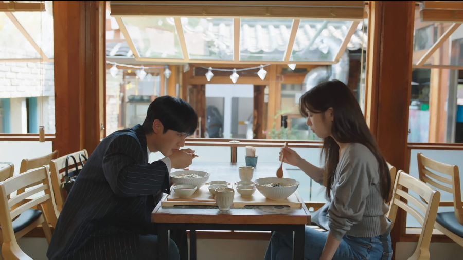 다음날 석류를 집앞에서 기다리던 승효는 석류를 데리고 맛있는 죽을 먹으러 갑니다. 석류는 승효 앞이라서 죽을 맛있게 다 먹었지만 아직 상태가 좋지는 못합니다.